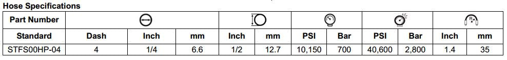 Combine arimid and steel braid construction for compact design. Lieghtweight and flexible. Small bend raduid for use on hose reels. Anti-abrasion cover. Standards: Meets material handling institute specification IJ 100 (1/4") for hydraulic hose and assemblies used with jacking systems. Tube: Polyester elastomer Reinforcement: One or two braids of aramid fibre plus one steel braid Cover: Polyurethane, black, pinpricked, white ink-jet branding Recommended Fluids: Hydraulic fluid, petroleum-based;Glycol, water-based Temperature Range: -40°F to +212°F (-40°C to +100°C) continuous, +158°F (+70°C) for water-based fluids