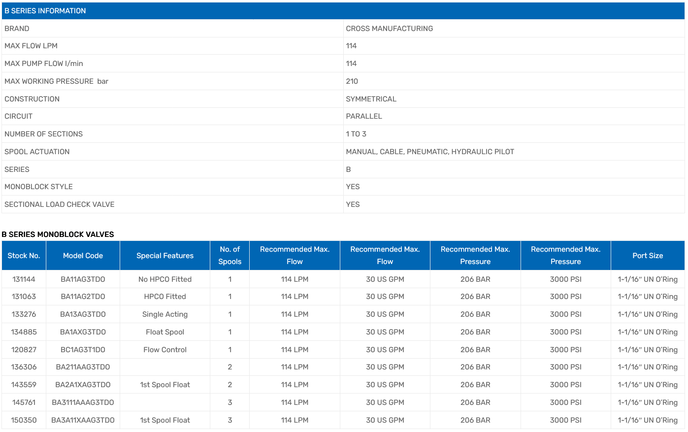 The CROSS series B directional control valves provide good metering characteristics and long dependable service life.