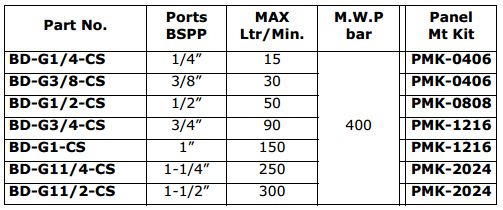 BD Series bi-directional non compensated needle valve. Optional panel mount kit available. Ports: 1/4" BSPP to 2" BSPP