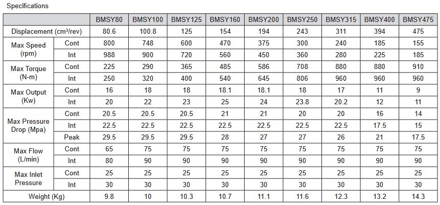The BMSY’s have a continuous speed range of 27~800rpm and continuous torque up to 910Nm, depending on displacement.
