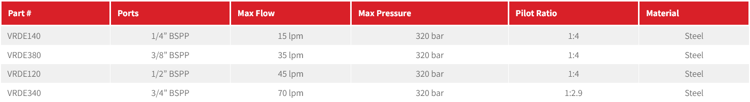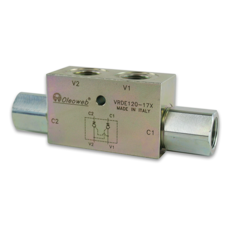 VRDE Series dual inline pilot check valve, manufactured in Italy by Oleoweb.