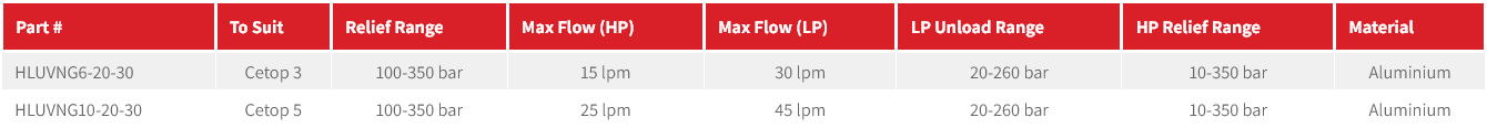 HLUVNG Series high-low unloading valve for cetop 3 and cetop 5, manufactured in Italy.