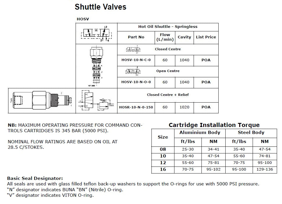 This unit is a direct action, screw in, catridge style, spool type, hydraulic 3 Way, 2-Position. Directional shuttle valve,which may be used on a hydrostatic transmission to direct charge pump oil to heat exchanger or tank. HOSV - Is a hot oil shuttle valve, spool type springless without relief HOSR - Is a hot oil shuttle valve, spool type springless with relief Specifications: Operating Pressure: 5,000 PSI (350 Bar) HOSV Flow: 23 LPM to 60 LPM HOSR Flow: 22.8 LPM Valve Housings: 2,500 PSI (210 Bar) = Aluminum 5,000 PSI (350 Bar) = Steel