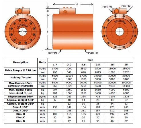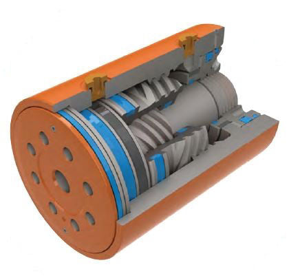 The L10 Series is Helac's smallest and most compact helical hydraulic actuator. Ideal for applications where space is of premium importance, the ultra-compact L10 series features extremely high thrust capacity in a sleek cylindrical design with flanged mounting and flanged output. Helac's helical hydraulic sliding spline technology is not self-locking and provides high stock resistance and high holding torque for demanding applications. Functioning as a rotating device, mounting bracket and load bearing structure, the L10 Series eliminates the need for external bearing systems, brakes or locking devices. Five standard sizes with torque outputs up to 25,000 in/lbs at 3000 psi (2825 Nm at 210 bar) are variable. NB: Custom rotation limits available on request