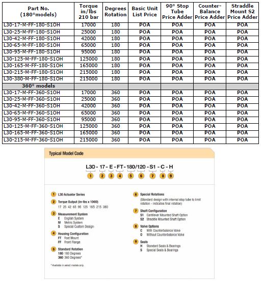 The L30 Series is our heavy duty helical hydraulic actuator and is suitable for harsh environments. Designed for applications that require ultra high bearing capacity, the L30 Series features foot or flange mount with flange output. Helac's helical sliding spline technology is not self-locking and provides high shock resistance and high holding torque for demanding applications. Functioning as a rotating device, mounting bracket and load bearing structure, the L30 Series eliminates the need for external bearing systems, brakes or locking devices. Nine standard sizes with torque output up to 380,000 in/lbs at 3000 psi (43,000 Nm at 210 bar) are available. NB: Custom rotation limits available on request