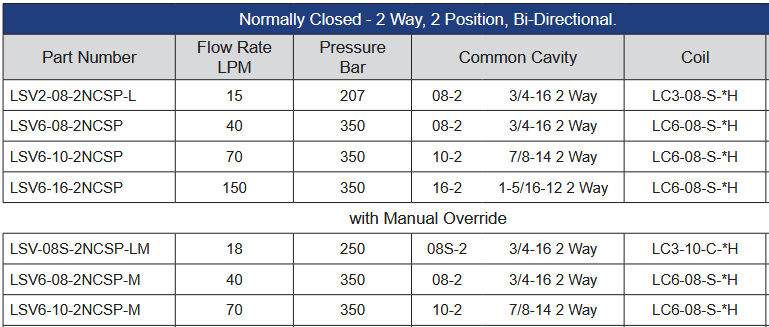 LSV Series Solenoid Operated Cartridge Valves - Normally Closed - 2 Way, 2 Position, Bi-Directional