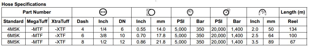 Recommended For: High pressure hydraulic applications. Provides tighter than standard minimum bend radius and greater flexibility for easier plumbing. Meets flame resistance acceptance designation "MSHA 2G" Tube: Black, oil-resistant, synthetic rubber (Nitrile- Type C). Reinforcement: Two braids of high tensile steel wire. Cover: Black, oil, abrasion and weather resistant, synthetic rubber (Modified Nitrile- Type C ). XtraTuff® hose lasts up to 25 times longer than the standard hose during hose-to-hose and hose-to-metal abrasion tests. MegaTuff® Hose lasts up to 300 times longer than the standard hose during hose-to-hose and hose-to-metal abrasion tests. Temperature Range: -40°F to +212°F (-40 C to +100 C). Couplings: Gates Mega-Crimp series.