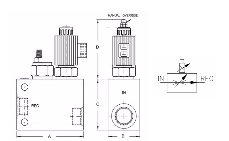 This unit is an electro-proportional, 2 port pressure compensated flow control valve. When the coil is energised the armature moves the metering orifice against a precision bias spring varying the flow. A pressure compensator modulates the flow to ensure constant flow at the REG port regardless of the operating pressure.