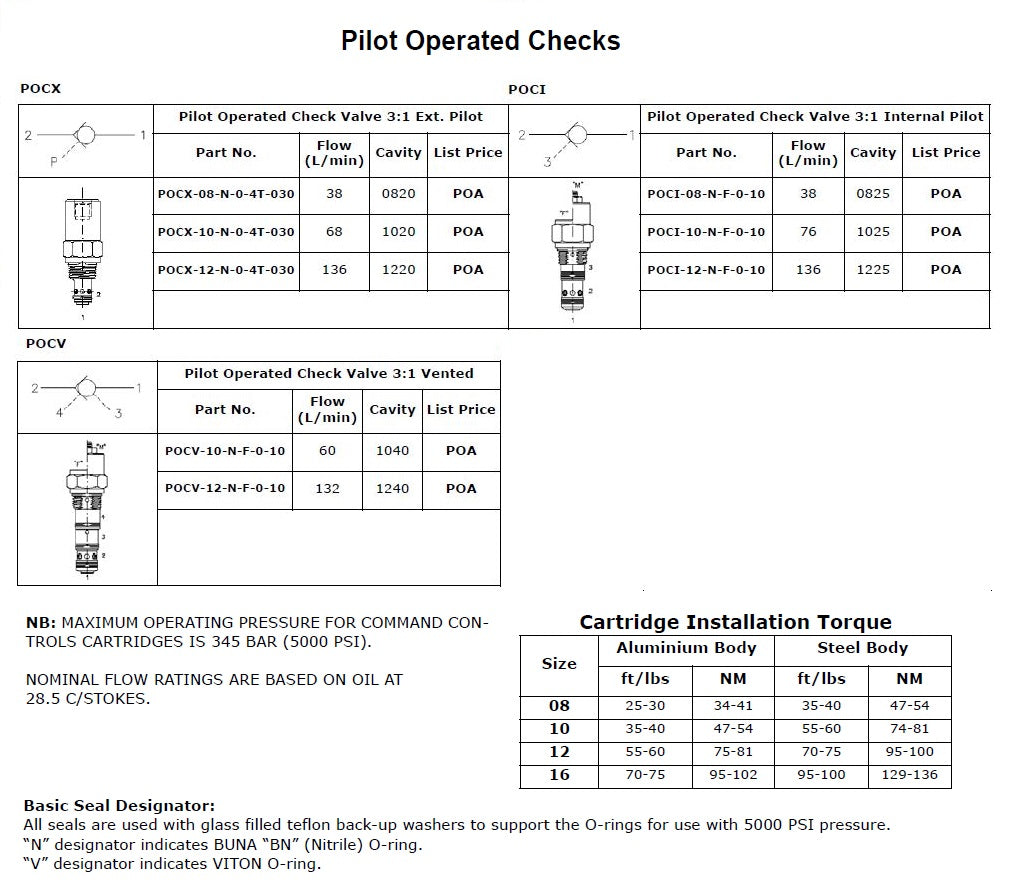 This unit is a screw in, catridge type, guided poppet, hydraulic pilot operated check valve, for use as a blocking or load holding device for high pressure applicatons. POCX - Is a poppet type external pilot to open with 3:1 pilot ratio. POCI - Is a poppet type internal pilot to open with 3:1 pilot ratio. POCV - Is a poppet type internal pilot to open with 3:1 pilot ratio vented on port 3. Specifications: Operating Pressure: 5,000 PSI (350 Bar) POCX Flow: 38 LPM to 136 LPM POCI Flow: 38 LPM to 136 LPM POCV Flow: 60LPM to 132LPM Valve Housings: 2,500 PSI (210 Bar) = Aluminum 5,000 PSI (350 Bar) = Steel