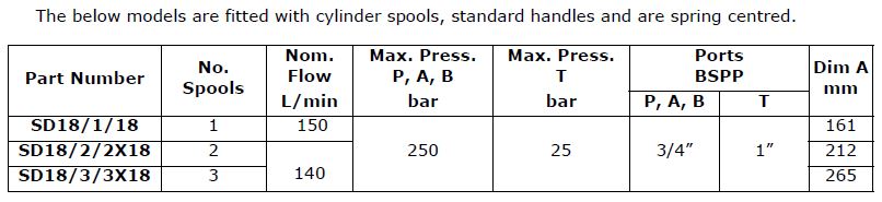 1 to 3 spools for open or closed centre applications. Fitted with direct or pilot operated main pressure relief. Available in parallel circuit only. Optional power beyond port. Ø25mm interchangeable spools. Available with manual, electro-hydraulic, pneumatic, hydraulic pilot and cable spool control.