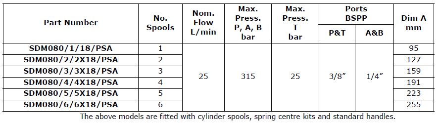 1 to 4 sections for open and closed centre. Fitted with main pressure relief and load check. Available in parallel or tandem circuit. Optional carry-over port. Ø14mm interchangeable spools. Available with microswitch and cable spool control.
