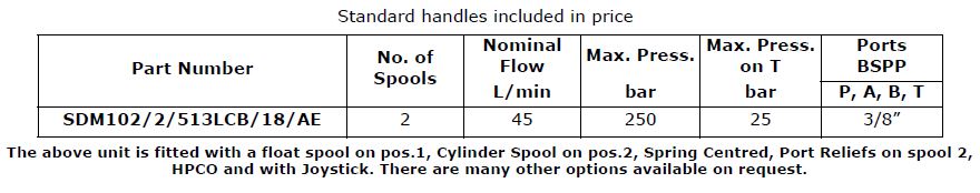 Twin spool open or closed centre circuit options. Fitted with main pressure relief and load check on each working section. Available with: Port Relief and anti-cavitation circuit valves. Power beyond port. Ø16mm interchangeable spools. Manual or cable spool control.