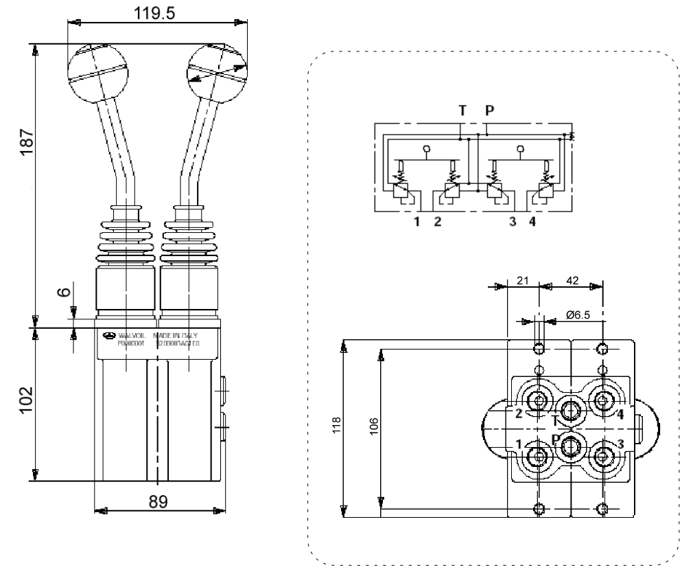 Monoblock hydraulic pilot valve with 2 levers and 4 work ports.