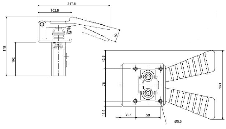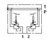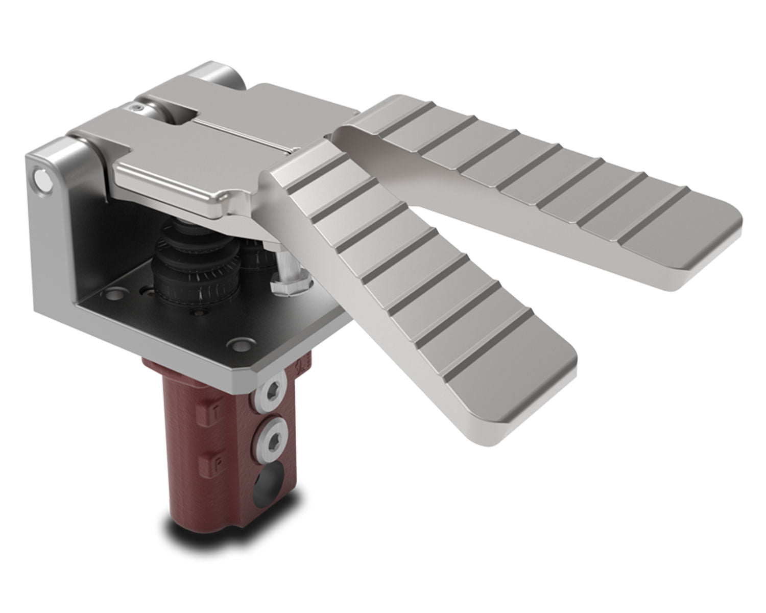 Monoblock hydraulic pilot valve with 2 foot pedals and 2 work ports. Steel body.