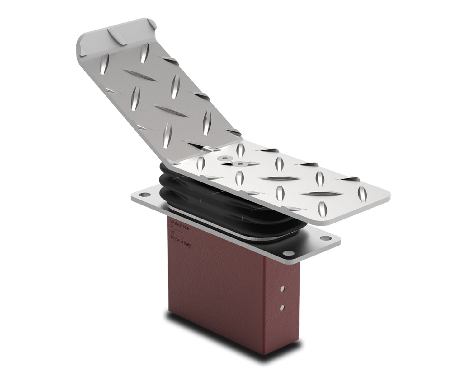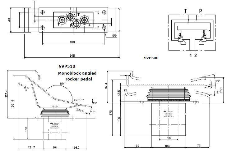 Monoblock hydraulic pilot valve with rocker, foot pedal and 2 work ports. Steel body.