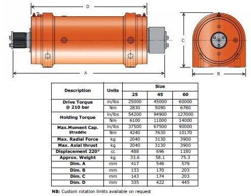 The T20 Series is ideal for applications where torque generation and higher cycle rates are the primary requirements. It features splined output shafts and 200-220 degrees of rotation. Helac's helical sliding spline technology is not self-locking and provides high shock resistance and high holding torque for demanding applications. Functioning as a rotation device, mounting bracket and load bearing structure, the T20 series eliminates the need for external bearing systems, brakes or locking devices. Three standard sizes with torque outputs up to 60.000 in/lbs at 3000 psi (6,780 Nm at 210 bar) are available. NB: Custom rotation limits available on request
