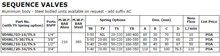 VDSRL Series Sequence valves direct acting guided poppet type. It allows flow from D to C when the pressure in D achieves the spring setting. Should there be pressure in C then the opening pressure at D will be the same as the spring setting pressure plus the pressure in C. Flow from C to D is free via a check valve. Aluminium body - Steel bodied units available on request - add suffix AC Various pressure range option available. Refer to Technical specification. Port: 1/4" BSPP to 3/4" BSPP
