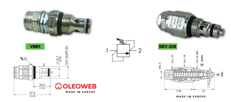 Cartridge relief valves with SAE08-2 cavity, manufactured in Italy.