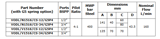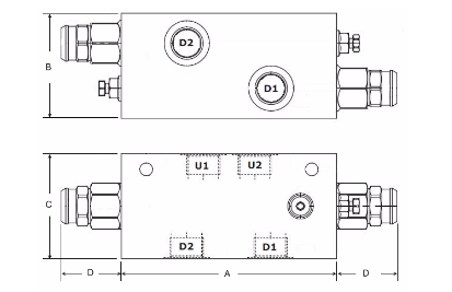 N1516 series - This valve controls a moving load preventing it from moving ahead of the pump and locks the load in any position on U1 and U2. It also provides static overload and thermal expansion protection when used in combination with an open centre spool valve. It permits free flown from D1 to U1 and D2 to U2 and blocks the flow from U1 to D1 and U2 to D2 until a pilot pressure generated at D1 or D2 is sufficient to pilot the U1 or U2 port open. This model is sensitive to back pressure on D1 and D2 in return mode.