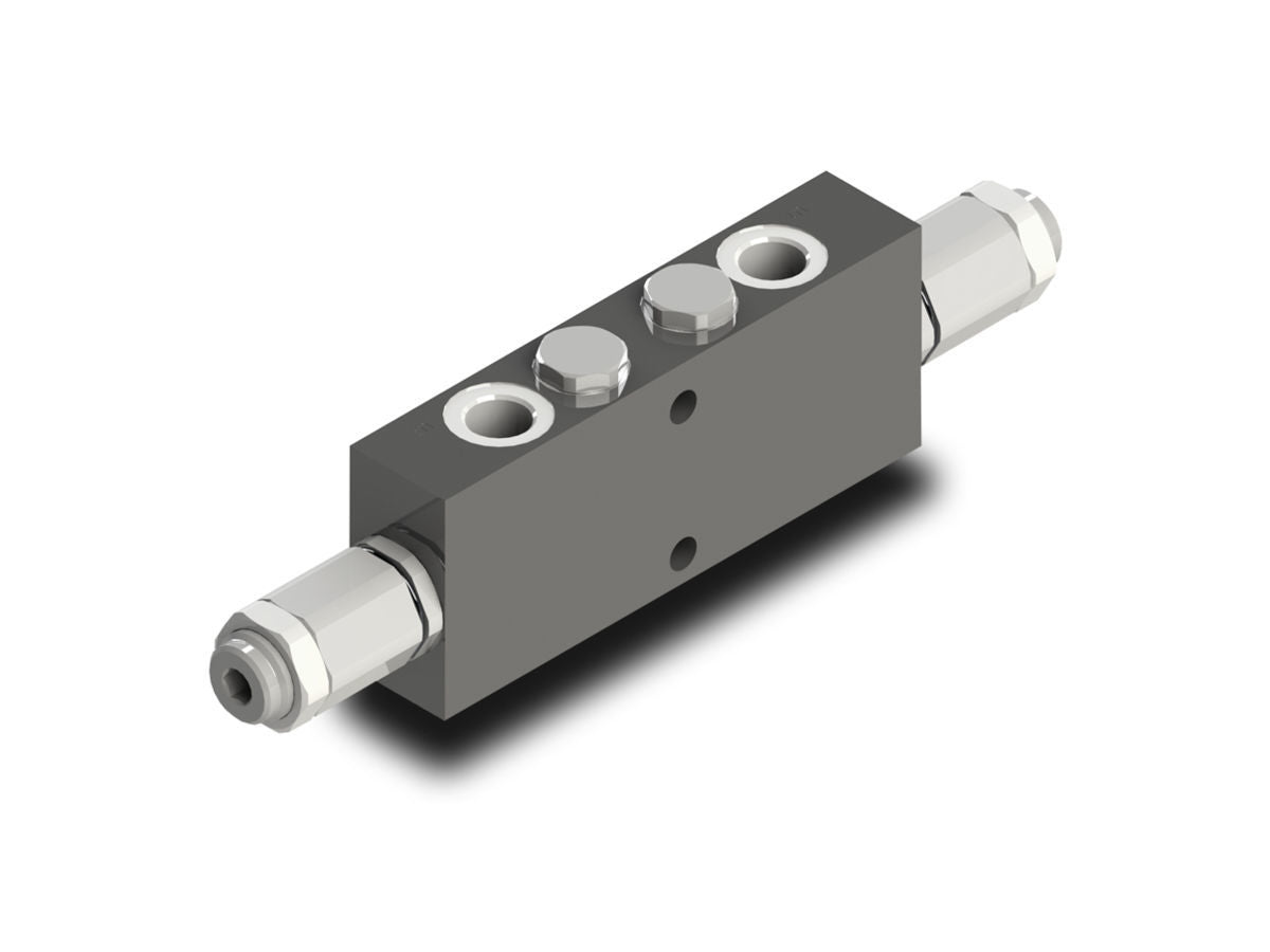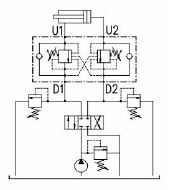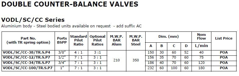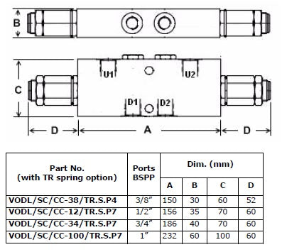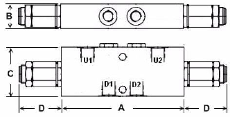 VODL/SC/CC Series - Aluminium body - Steel bodied units available on request - add suffix AC This valve controls a moving load in both directions preventing it from moving ahead of the pump and locks the load in any position on U1 and U2. This valve permits free flow from D1 to U1 & D2 to U2 and blocks the flow from U1 to D1 to D2 until a pilot pressure generated at D1 or D2 is sufficient to pilot the U1 or U2 port open. It is utilised in combination with a closed centre spool valve. It is recommended to fit a port relief in this application.