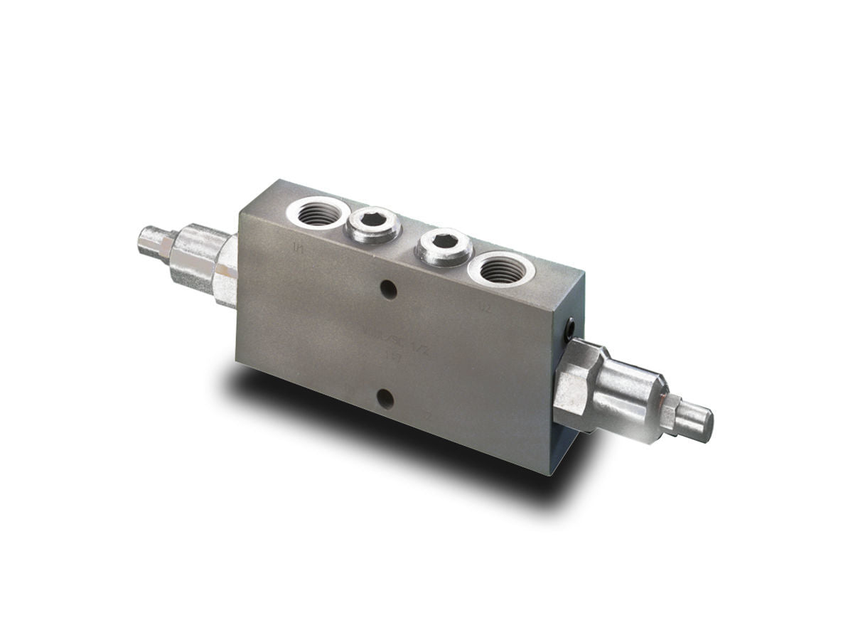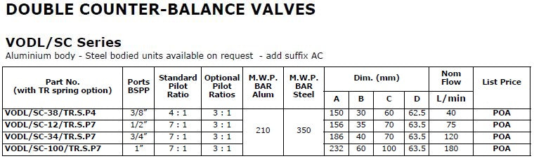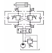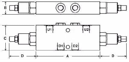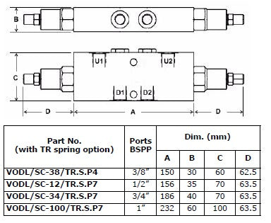 VODL/SC Series - Aluminium body - Steel bodied units available on request - add suffix AC This valve controls a moving load in both directions preventing it from moving ahead of the pump and locks the load in any position on U1 and U2. It also provides static overload and thermal expansion protection when used in combination with an open centre spool valve. This valve permits free flow from D1 to U1 & D2 to U2 and blocks the flow from U1 to D1 & U2 to D2 until a pilot pressure generated at D1 or D2 is sufficient to pilot the U1 or U2 port open.
