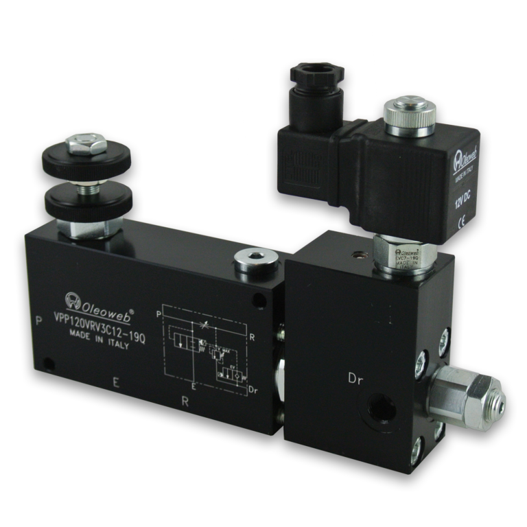 VPP Series pressure compensated priority flow control solenoid actuated with relief. Manufactured in Italy by Oleoweb.