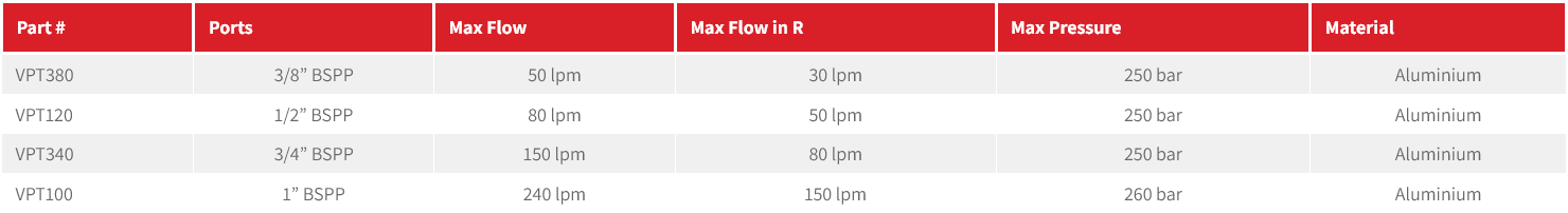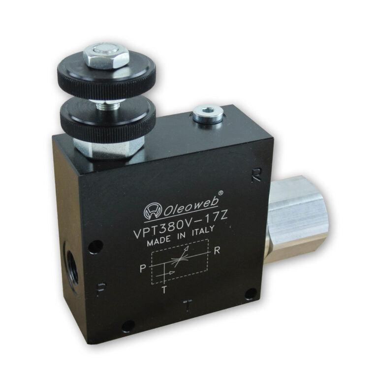 VPT Series pressure compensated priority flow control, excess to tank. Manufactured in Italy by Oleoweb.
